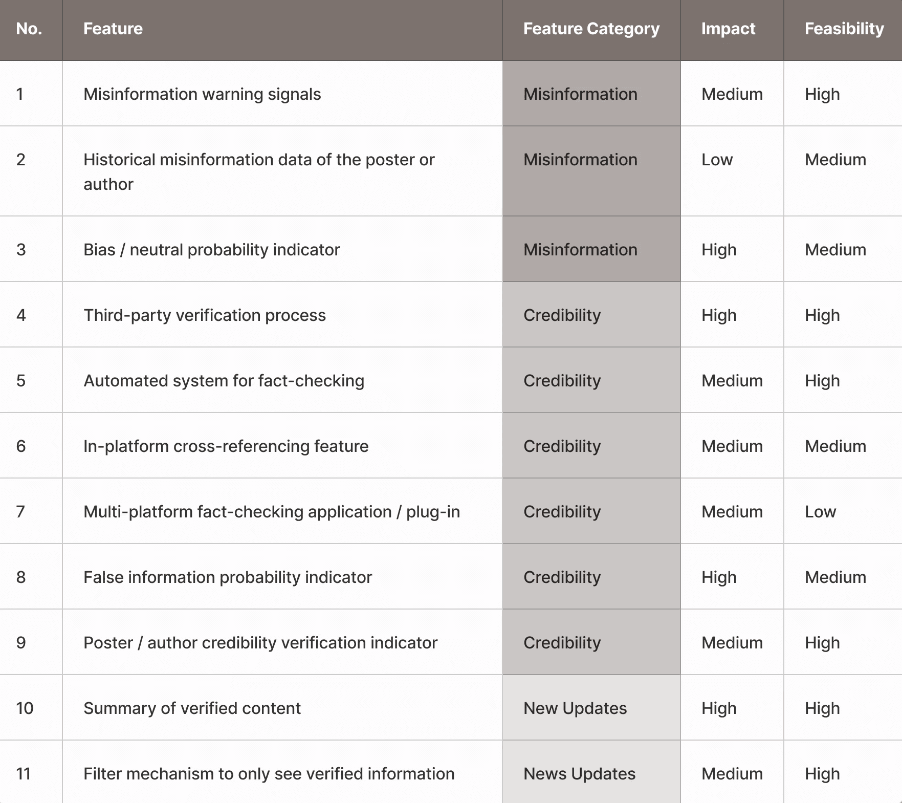 We grouped features into three main categories. The "misinformation" group warns users when content may be false. The "credibility" group provides objective fact-checking and verified information. And the "news updates" group offers a streamlined way to follow credible content.
