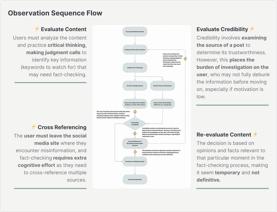 I created an observation sequence diagram that captured participant behavior during the study, revealing key decision points and breakdowns in the fact-checking process.